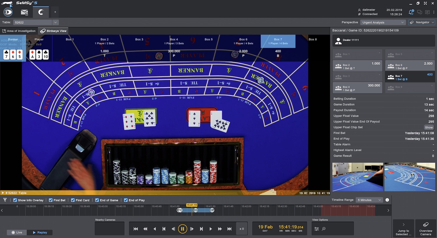 Gaming management will find a wealth of solutions within Dallmeier’s “Casino Automation Technology” (CAT) suite to manage and track table games. The suite is the first in-operation gaming automation and runs as an application in SeMSy®. It uses standard IP cameras and elements of AI to recognize chips and cards with very high accuracy. So, CAT can provide real-time information about bet position and value, game pace, float value and many more. The benefits are a highly increased game pace, an accurate player rating and a much more effective protection from fraud.