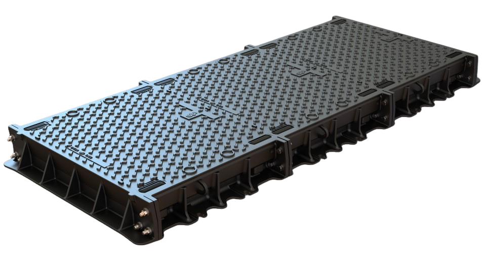 | Modular Construction: The ERMATIC® system is built from modular components such as side frames, end plates, and removable beams. This configuration allows for multiple layouts — from long linear openings to large chambers exceeding 1200 mm in width — offering exceptional adaptability for a wide range of underground networks. ERMATIC® solutions are pre-assembled before shipment for quality control, and covers are available with anti-slip surfaces or concrete in-fill depending on project requirements. | ![]() |