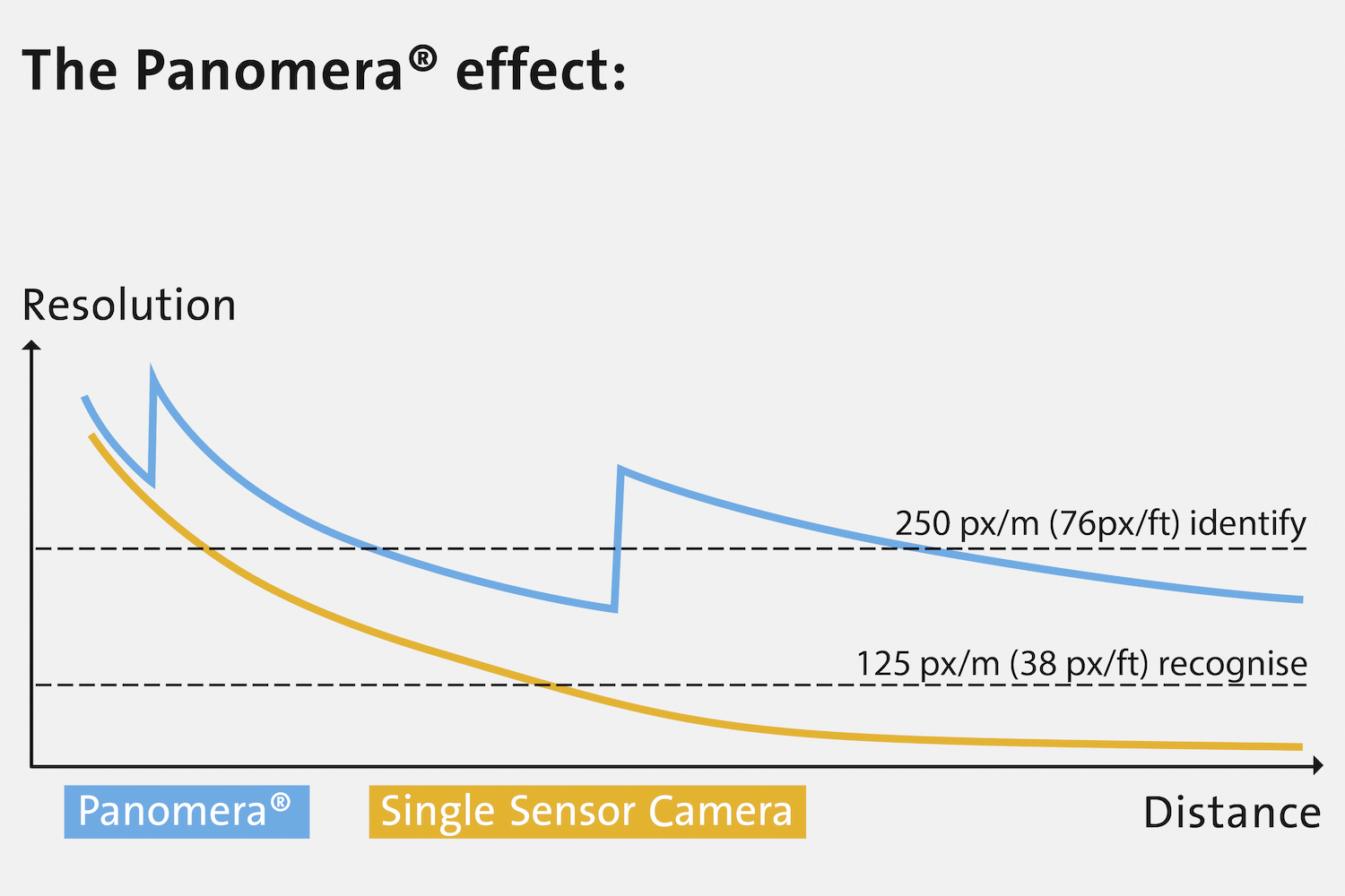 At the same time, the Panomera® cameras deliver “blanket coverage” in high image resolution in the truest sense of the word: In every partial region of the area to be monitored, the image quality does not fall below a defined minimum level. The decisive performance criterion here is the “resolution density”, which is defined in standard DIN EN 62676-4 with the unit “pixels per metre” (px/m). For example, in order to be able to identify an unknown person, at least 250 px/m are required in the corresponding section of the image. This ensures that the video recordings are usable in court and is also particularly important for video analysis applications (e.g., object classification) for which consistent, precisely planned minimum data quality is essential. This is also especially important with regard to future AI-based analysis procedures, which are not even available on the market yet. With Panomera®, the customer is thus able to ensure corresponding data quality for purposes of protecting their investment with the camera sensor system of today.