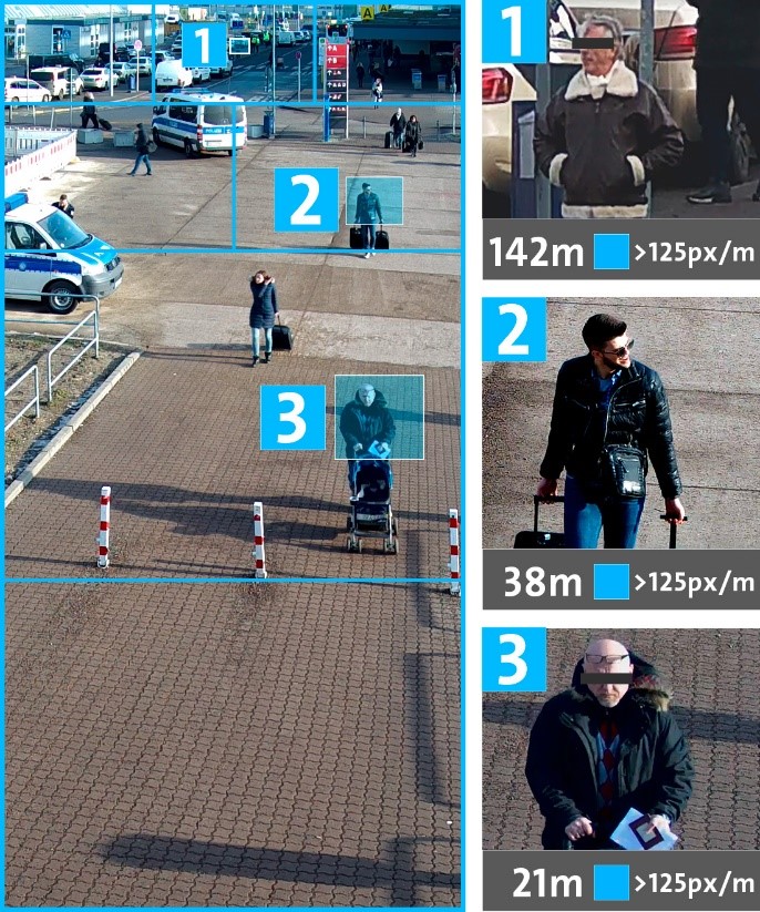 Example of “Recognising individuals”: The Panomera® effect ensures that the image resolution is always greater than 125 pixels per meter over the entire object space if this matches the customer’s specification.