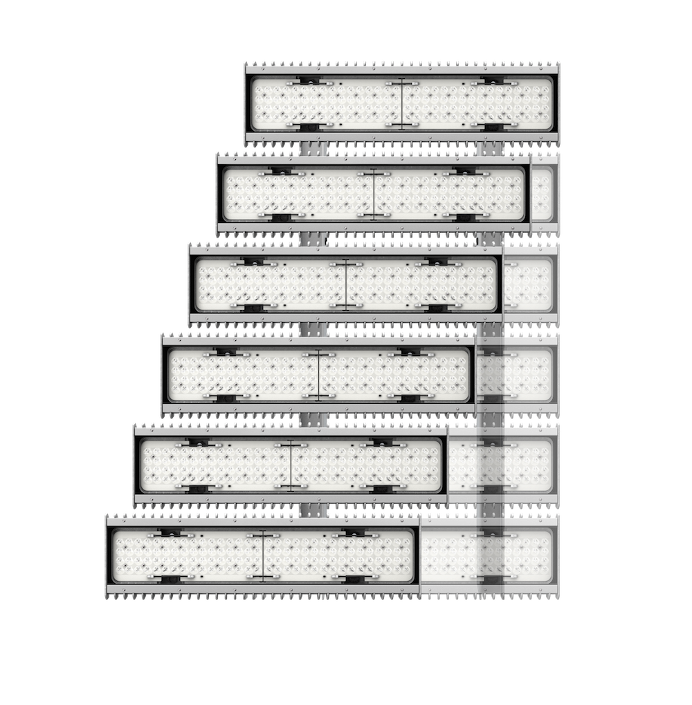 The modular construction R-System floodlight family consists of individual panels that are grouped in a corresponding arrangement (R1–R6) depending upon the output that is required. Every panel can be tilted and consists of 128 high-performance LEDs. The glass cover of the panels offers additional protection for the lens optics and makes simplified cleaning possible.