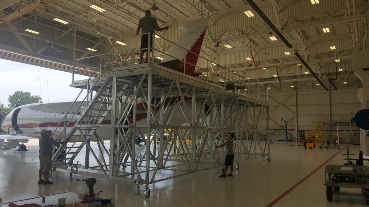 Whilst maintaining the Falcon 900, directors observed that technicians were using height access equipment—standard ladders and the like—that was slowing down the process and presenting fall dangers from various heights above the concrete floor. And this equipment wasn’t the best option for safely and efficiently scaling the French Falcon’s unusual tri-jet engine configuration.