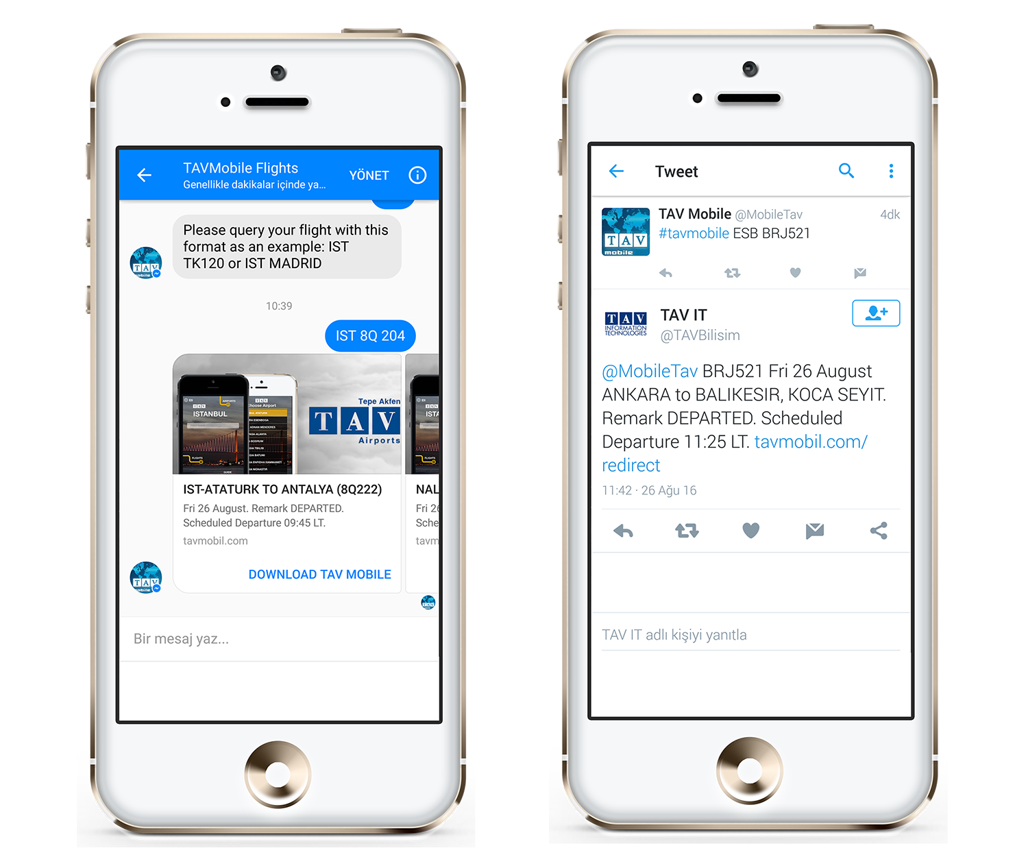 The users can see the latest status of their flights instantly by posting the flight number and city/destination information on Facebook and Twitter without any need to download any application. The passenger is greeted by a welcoming notice when s/he clicks on Message section on Facebook “TAVMobile Flights” page and receives directions on how s/he could make a search about the flights. The tweets posted by Twitter #tavmobile hashtag are responded in a few minutes by giving the information regarding the mentioned flight to the user.
