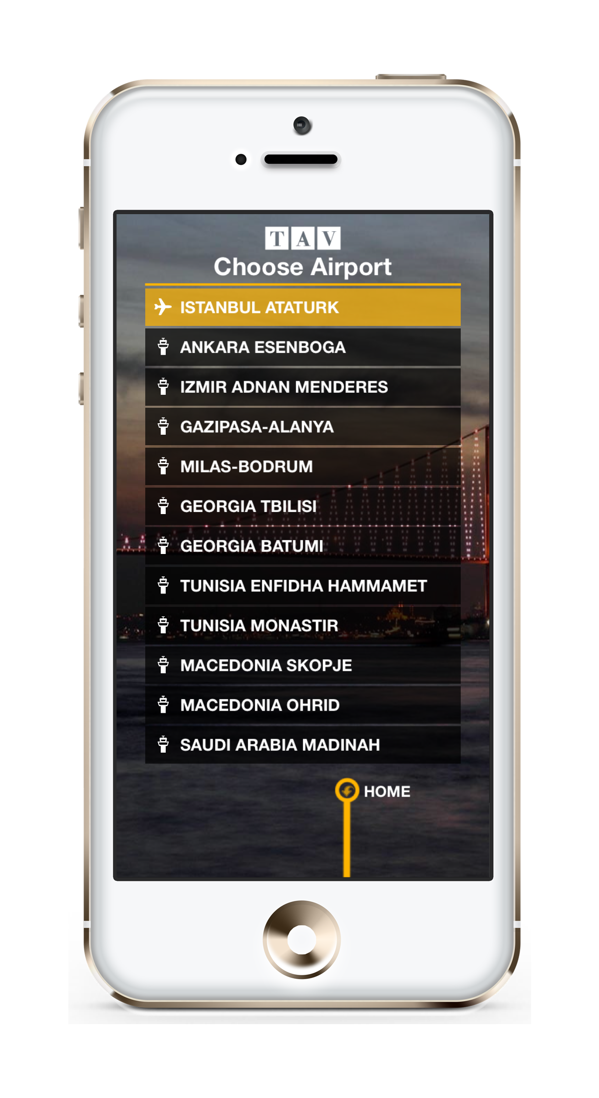 The TAV mobile application provides information about the Istanbul Atatürk, Ankara Esenbo?a, Izmir Adnan Menderes, Milas-Bodrum and Gazipa?a-Alanya airports in Turkey, and the Enfidha-Hammamet and Monastir airports in Tunisia, Tbilisi and Batumi airports in Georgia, Skopje and Ohrid airports in Macedonia, and Madinah Airport in Saudi Arabia.