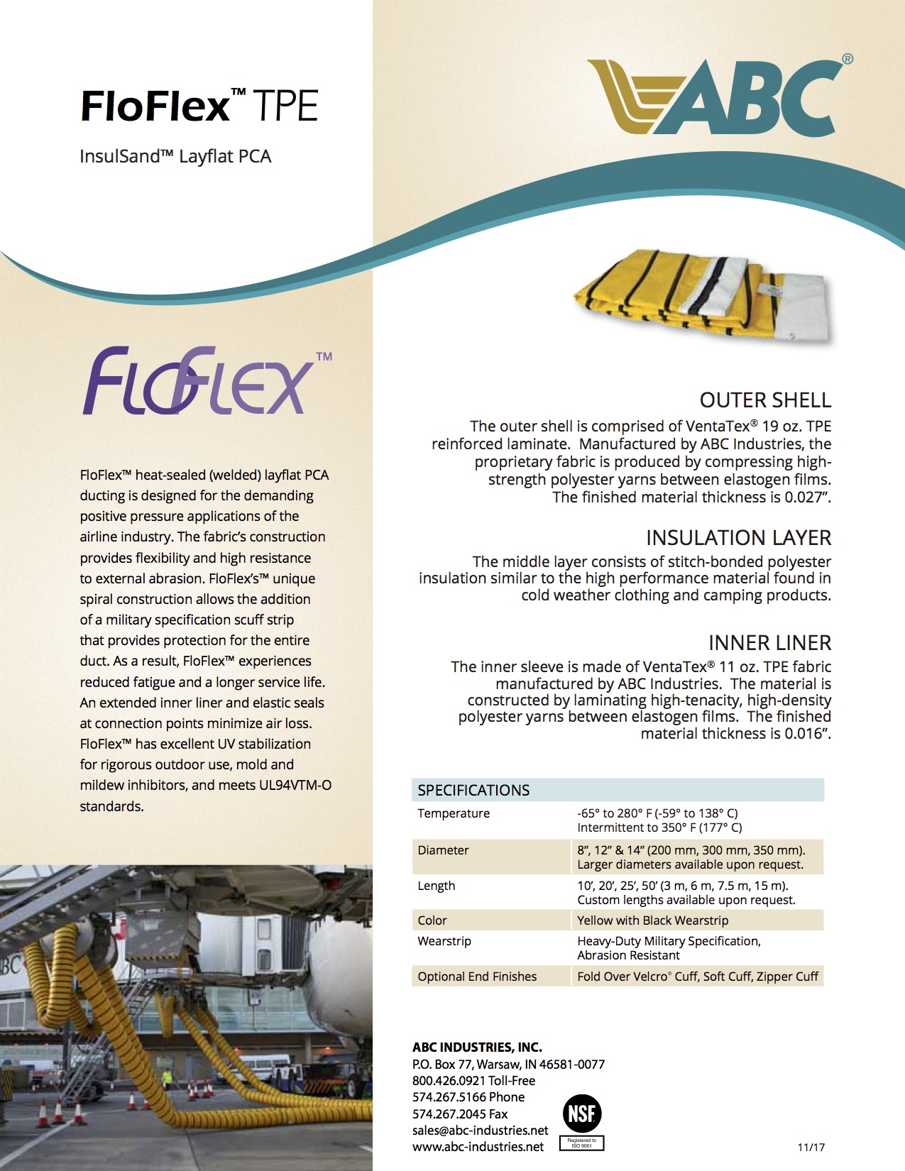 FloFlex™ is the most robust layflat PCA ducting on the market. It has a heavy-duty spiral wear-strip that meets military specifications and provides protection along the entire length of the duct. To improve abrasion, we use a 9mm high-molecular-weight PVC to the exterior layer with Rip-Stop™ technology. The insulation material is like the high-performance material found in cold-weather clothing and camping products. The ducting has excellent UV stabilization, mold-and-mildew inhibitors, and meets NFPA-701 Standards.