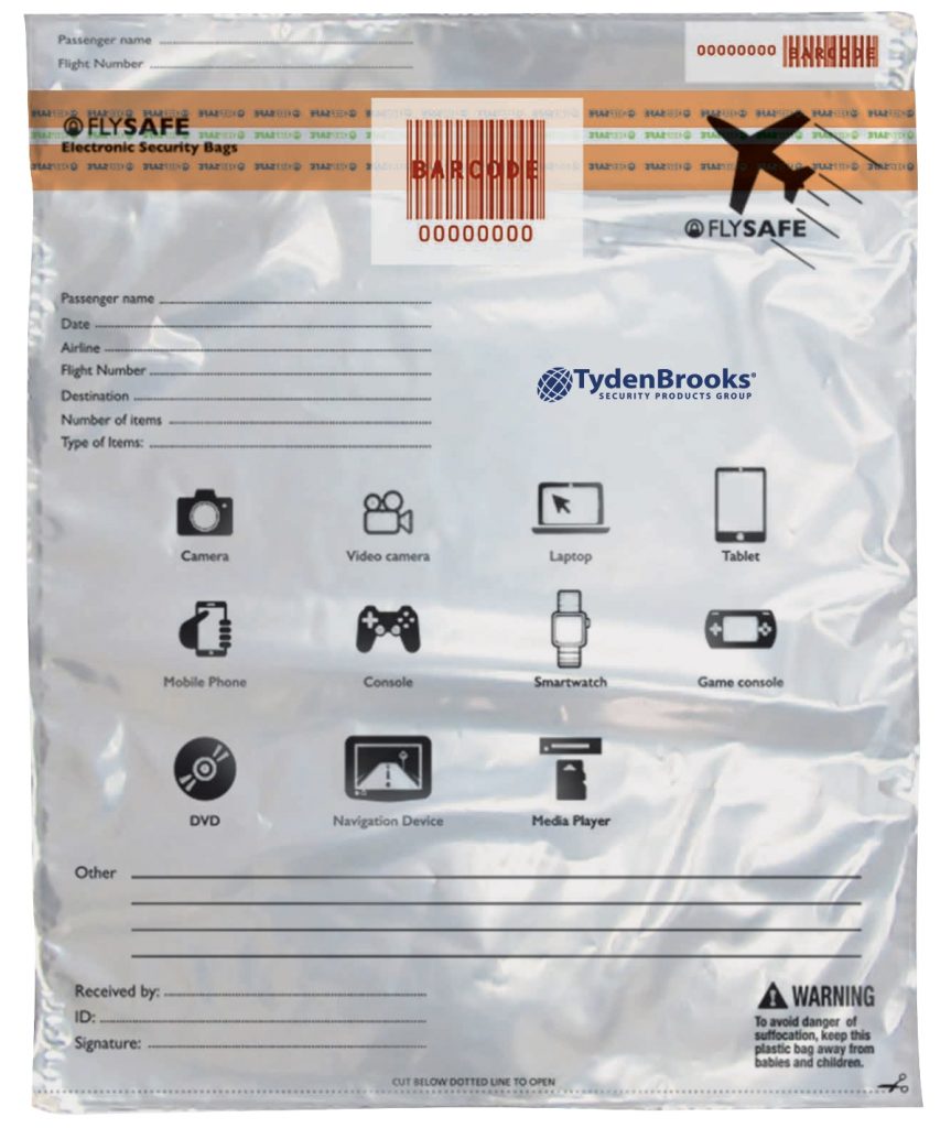 TydenBrooks’ FlySafe bag has been designed to ensure the safe custody of electronic and personal items when handed over to ground crew at the point of boarding. The FlySafe security bag enables the safe custody and transport of these items and helps to streamline the handling of electronic items. The security bag is for one-time use and incorporates a tamper evident seal with a unique barcode and numbering. The passenger’s electronic items are placed inside the bag by the passenger and sealed, in the presence of security staff at the hand-over point. The FlySafe bag hence offers full traceability of the electronic items and peace of mind to passengers.