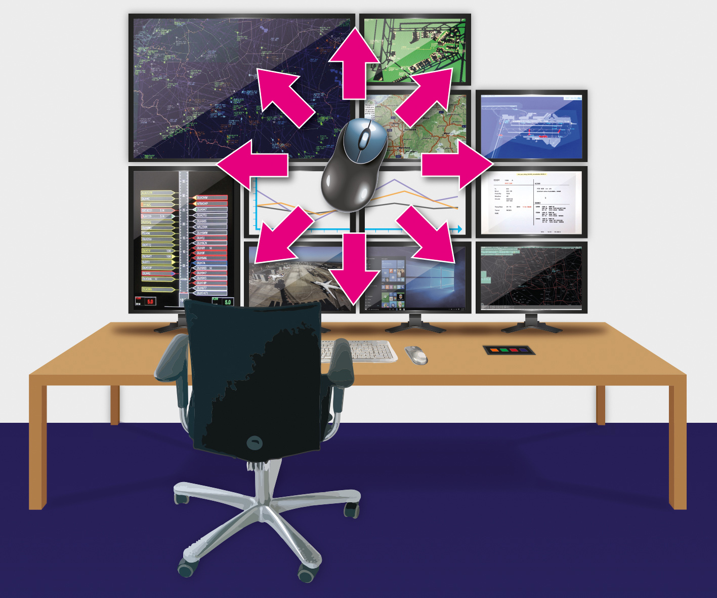 To particularly facilitate the system operation for ATCOs, G&D offer the CrossDisplay-Switching function. With this feature, the controller does not have to worry about the technical infrastructure in the background but can intuitively pursue his primary responsibilities: At a CWP, which is equipped with multiple monitors, the system can be operated with just one set of keyboard and mouse – even if the monitors are supplied by different computer systems. This does not only save peripherals but ensures clearly arranged workstations. On top of that, the function lets users switch from one computer system to the next without any additional operating steps. The operating focus simply follows the mouse pointer. If the mouse pointer is moved over the screen edge, the KVM system will automatically switch keyboard and mouse focus to the computer of the respective neighbouring screen.