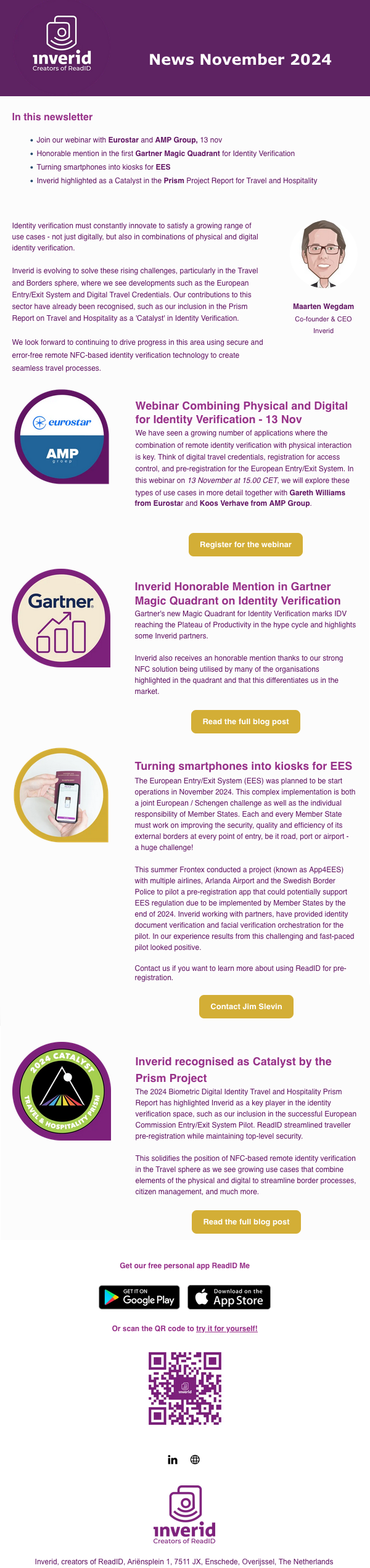 In this newsletter: Join our webinar with Eurostar and AMP Group, 13 nov, Honorable mention in the first Gartner Magic Quadrant for Identity Verification, Turning smartphones into kiosks for EES, Inverid highlighted as a Catalyst in the Prism Project Report for Travel and Hospitality…