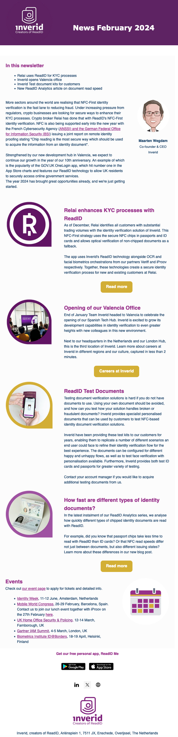 In this newsletter: Relai uses ReadID for KYC processes – Inverid opens Valencia office – Inverid Test document kits for customers – New ReadID Analytics article on document read speed. More sectors around the world are realising that NFC-First identity verification is the fast lane to reducing fraud…