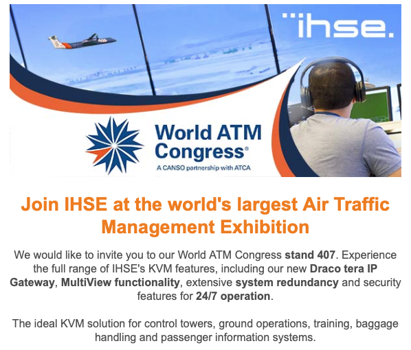 We would like to invite you to our World ATM Congress stand 407. Experience the full range of IHSE’s KVM features, including our new Draco tera IP Gateway, MultiView functionality, extensive system redundancy and security features for 24/7 operation. The ideal KVM solution for control towers, ground operations, training, baggage handling and passenger information systems.