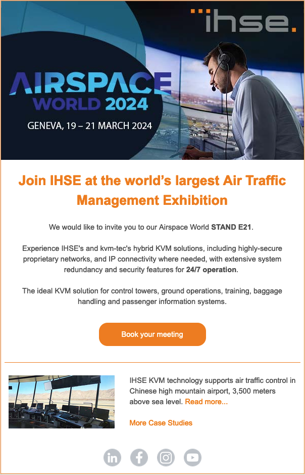 We would like to invite you to our Airspace World STAND E21. Experience IHSE’s and kvm-tec’s hybrid KVM solutions, including highly-secure proprietary networks, and IP connectivity where needed, with extensive system redundancy and security features for 24/7 operation.