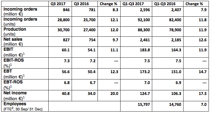The Jungheinrich Group ended the first nine months of 2017 with earnings before interest and taxes (EBIT) of €183.8 million (previous year: €164.3 million1). This improvement was primarily driven by the 12 per cent increase in units produced (88.3 thousand units; previous year: 78.9 thousand units). The EBIT return on sales (EBIT ROS) was on a par with the same period of the previous year at 7.5 per cent1. Earnings before taxes (EBT) rose to €173.2 million at the end of the first nine months (previous year: €151.0 million1). EBT return on sales (EBT ROS) came to 7.0 per cent (previous year: 6.9 per cent1).