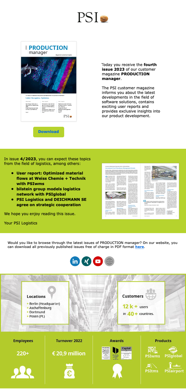 Today you receive the fourth issue 2023 of our customer magazine PRODUCTION manager. The PSI customer magazine informs you about the latest developments in the field of software solutions, contains exciting user reports and provides exclusive insights into our product development.