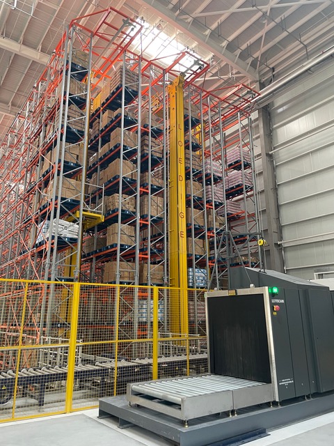 The fully automated ASRS is integrated into the warehouse management system and connected to the catering kitchen by AGV transport.