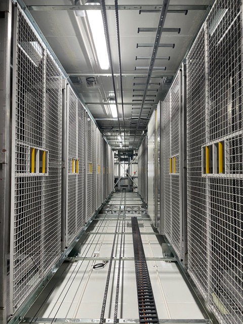 Goods for the new catering facility are received in a separate warehouse building which is equipped with a fully automated storage and retrieval system with three stacker cranes. The fully automated storage and retrieval system (ASRS) loads goods through vertical stacking on 13 levels. Items are stored and retrieved without manual effort by personnel, improving accuracy and productivity, while minimising safety risks, accidents, and errors. When required, items are retrieved automatically and transported through a 130 m long tunnel that connects buildings using automated guided vehicles (AGV), directed by the warehouse management system (WMS), thus providing the facility with a high degree of both accuracy and flexibility.