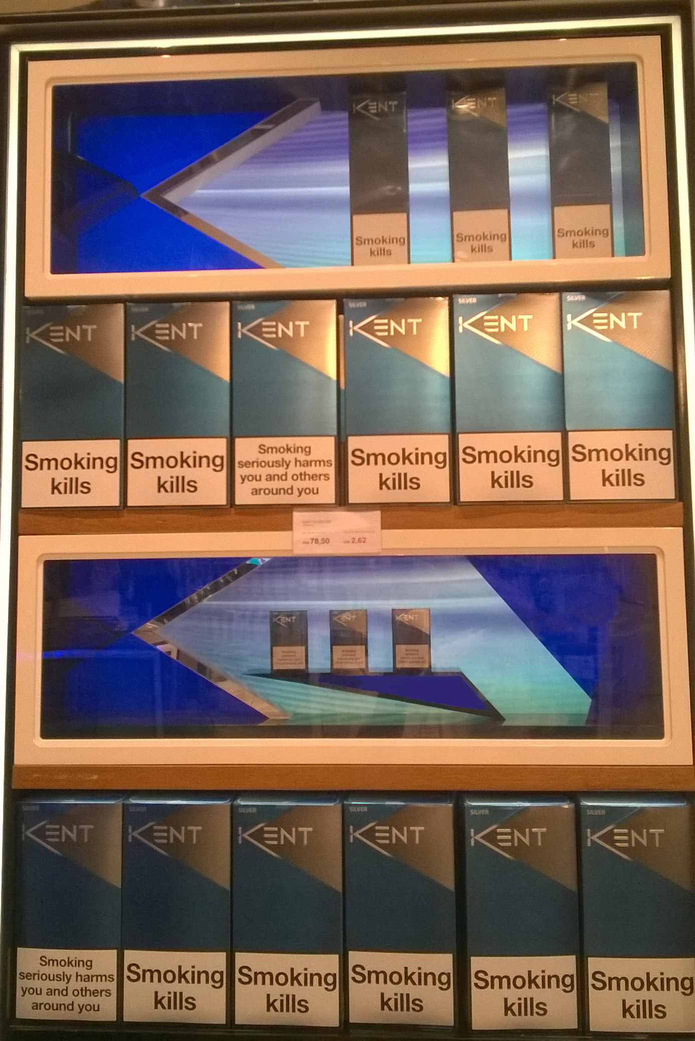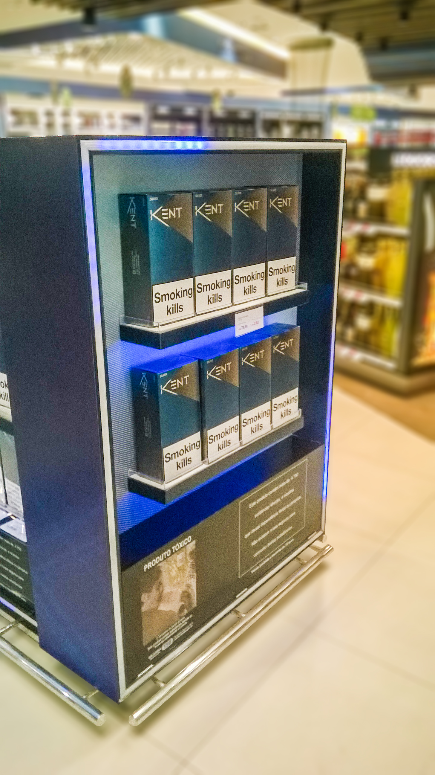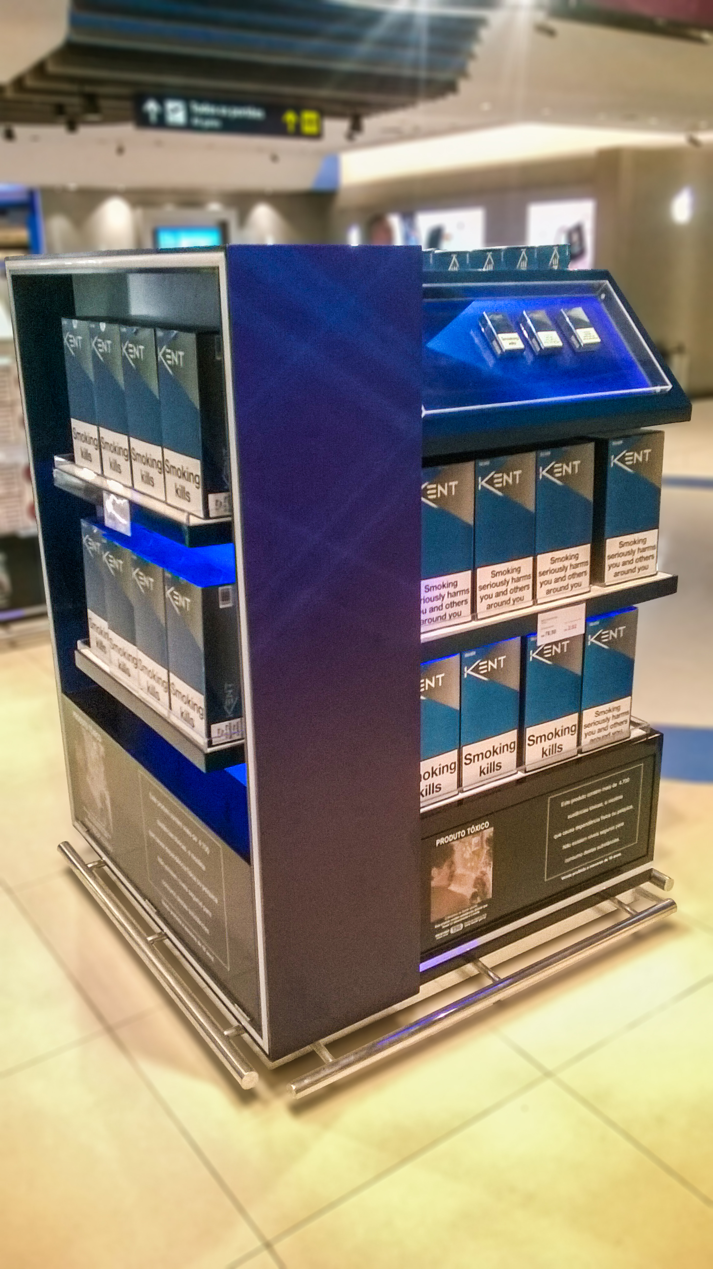 Blue and Red LED lights frame the units and bring the eye towards the product on the illuminated shelves. Each brand is surrounded by a glow of its own branded colour, blue for Kent and red for Lucky Strike. Combined with the edge lighting are glorifiers for each brand which are used to display an individual pack. The simple use of light ensures a clean and modern look is created.
