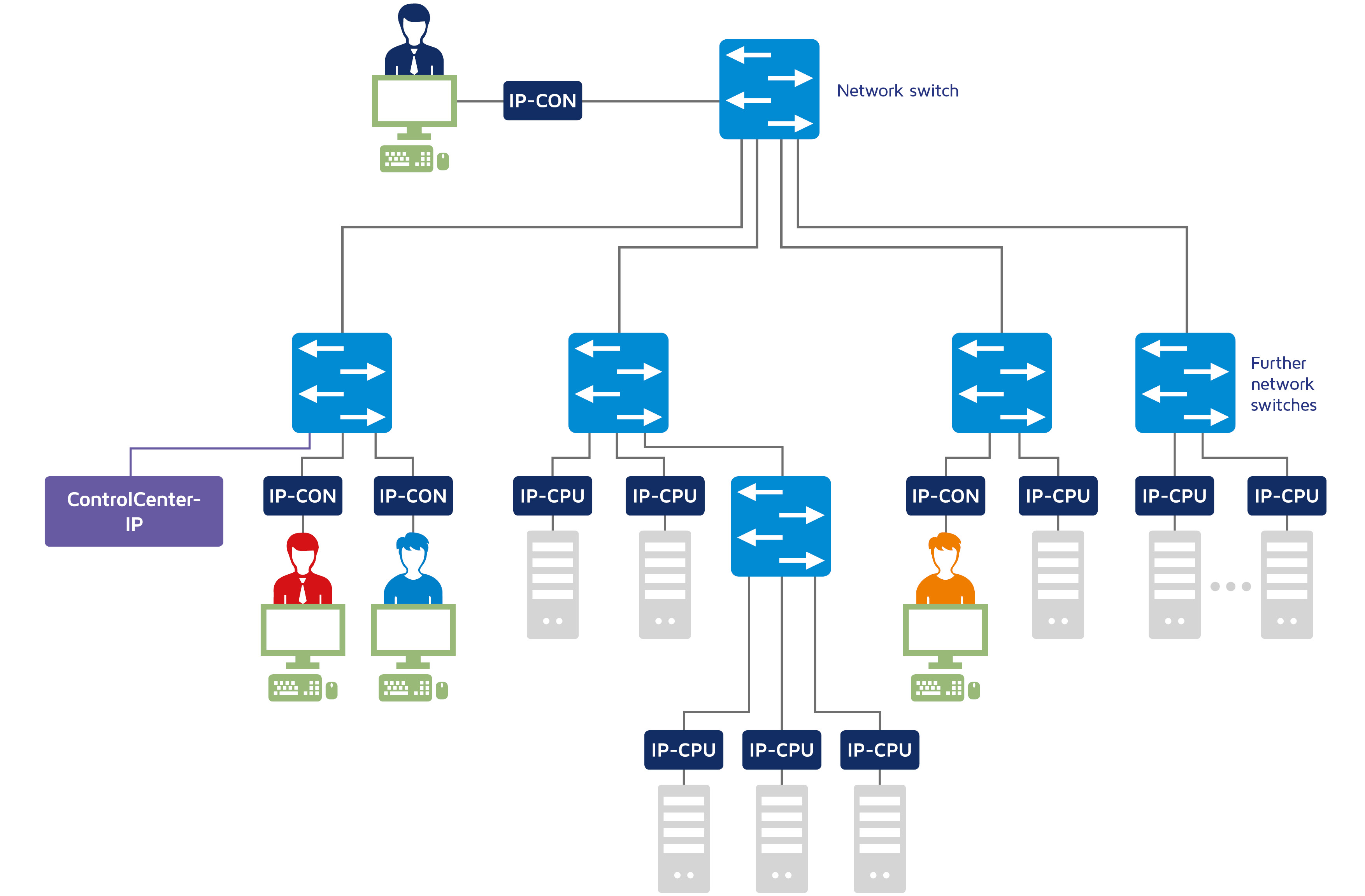 The additional network integration of the ControlCenter-IP turns the extender systems, which have so far only implemented a point-to-point connection between computer and workstation over IP, into a powerful KVM matrix. Now every connected workstation can be granted access to any computer connected to the KVM system. Both the dynamic access and the use of KVM-over-IP™ give the application twice the flexibility. Secure and reliable operation is ensured by AES-128 encryption and the support of important aspects of quality of service.