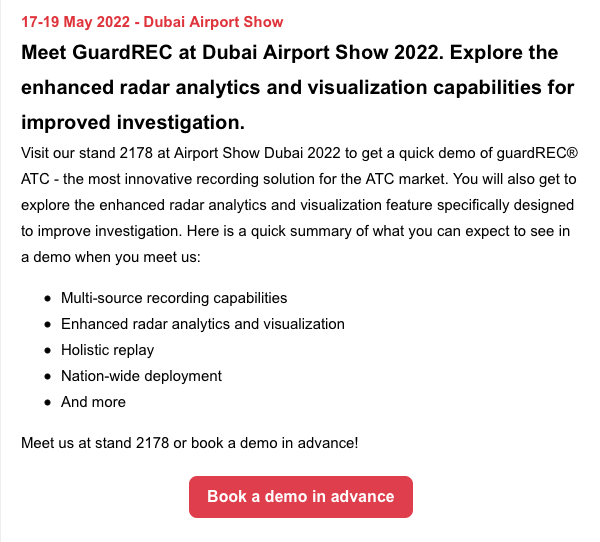 Visit our stand 2178 at Airport Show Dubai 2022 to get a quick demo of guardREC® ATC – the most innovative recording solution for the ATC market. You will also get to explore the enhanced radar analytics and visualization feature specifically designed to improve investigation.
