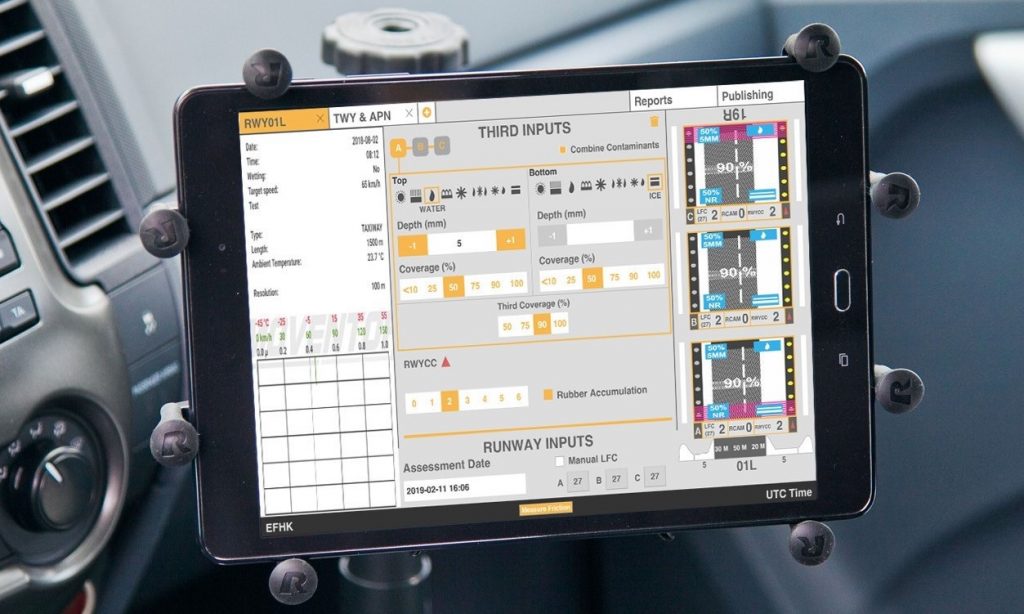 Mobile software working inside the inspection vehicle is a modern tool for runway inspectors to report runway conditions. It is designed to work on a touch screen tablet computer. To utilize the real-time status of runways, WiFi, or mobile network connection is a great benefit. This way the reporting is instant from the inspection vehicle. Mobile software sends information to the server which generates SNOWTAM syntax according to ICAO Global Reporting Format (GRF). The server forwards the data to relevant parties such as Eurocontrol, tower (ATC), Briefing (C), and others based on customer’s needs. The outputs can be customized to match the requirements. The inspectors can back up their RWYCC decision-making with familiar friction testing results.