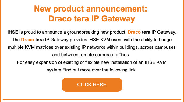 New product announcement: Draco tera IP Gateway – IHSE is proud to announce a groundbreaking new product: Draco tera IP Gateway. The Draco tera IP Gateway provides IHSE KVM users with the ability to bridge multiple KVM matrices over existing IP networks within buildings, across campuses and between remote corporate offices.