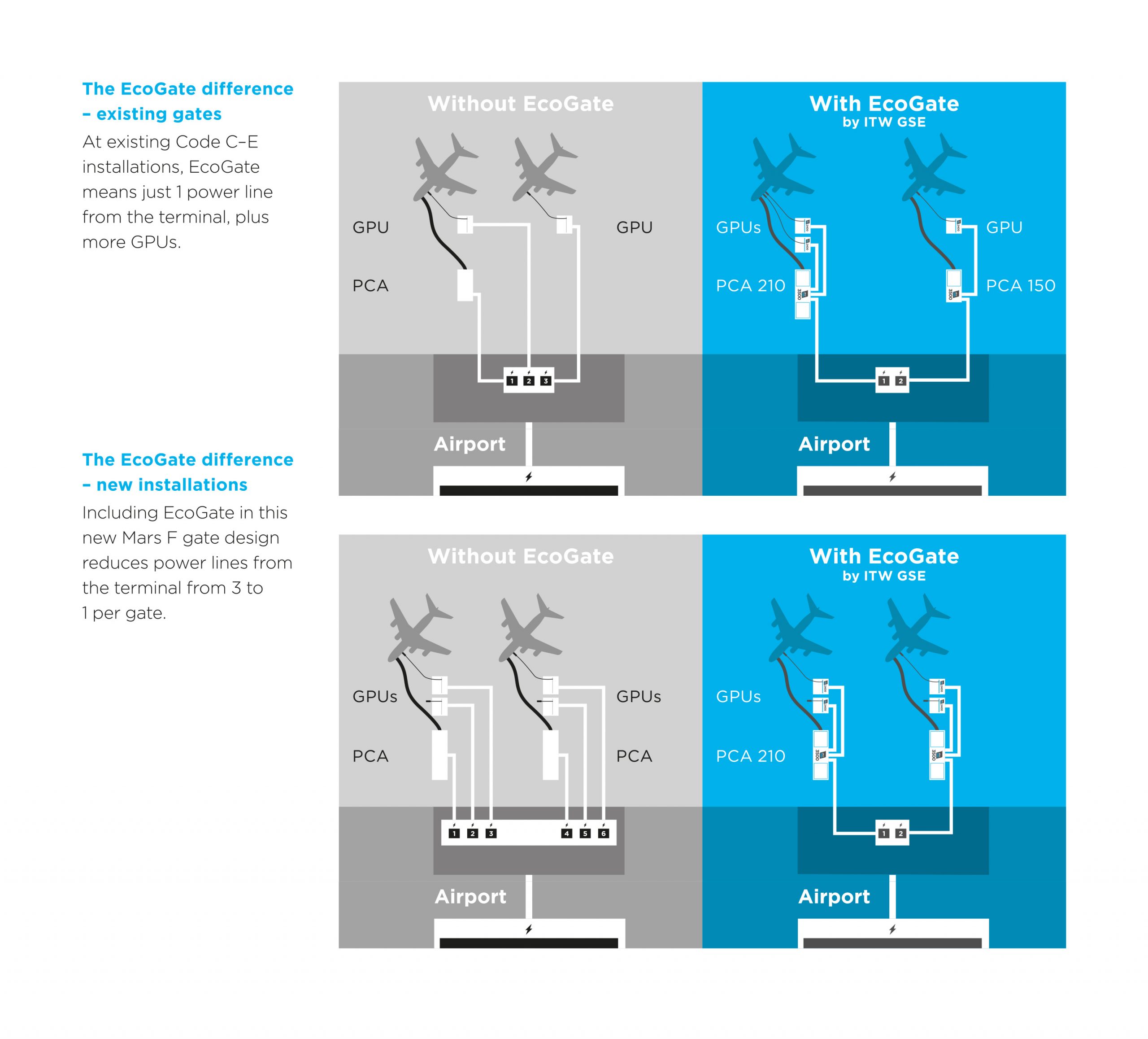 Beyond Intelligent Power Management, EcoGate integrates functionality as diverse as automated aircraft type detection and management of charging stations for battery-powered equipment into a unified system. Integrating these technologies ensures an easier learning curve for operators, less risk of human error, lower installation costs, and carbon footprint reductions via further electrification – in addition to the smarter use of available power.