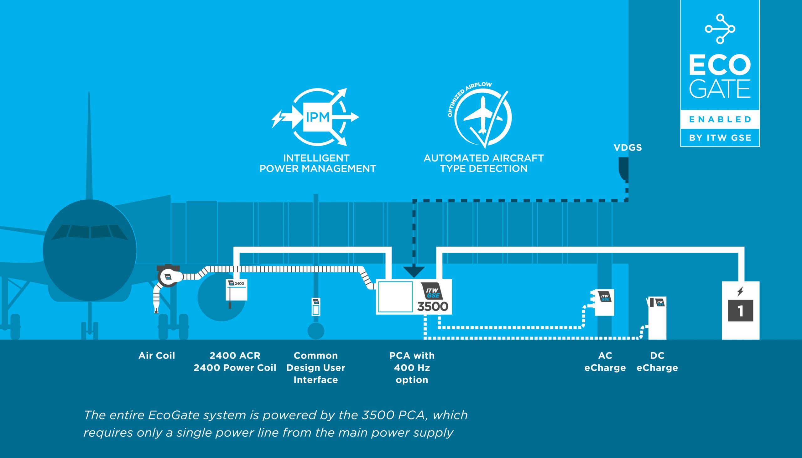 ITW GSE has launched a set of technologies that enables individual ground support units such as GPUs, PCAs, charging stations and even aircraft detection systems to all work together. Dubbed EcoGate, the solution was developed to help airports achieve efficiencies that can only be realized by linking gate equipment into an integrated, intelligent system.