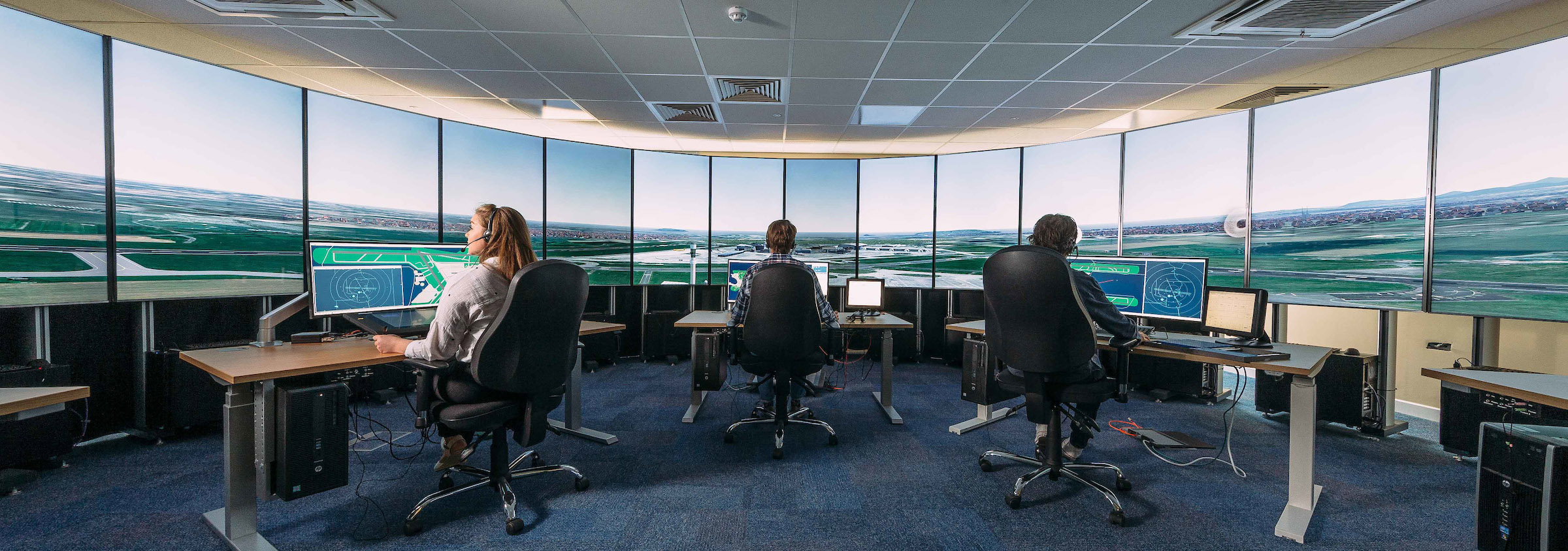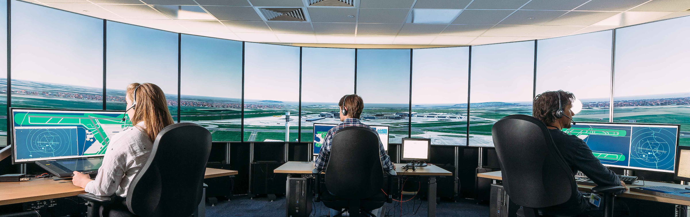 The new simulator consists of twenty-two 65″ UHD displays that are driven by a similar total of high performance image generators incorporating top quality graphics cards. The display system gives a 270° horizontal field of view, and has a diameter of 8 metres with a height of 1.5 metres. It is also possible to show a 360° field of view on the physical 270° screen. The system provides an ultra-sharp picture, as 47,500 x 3,840 pixels are projected onto a 19 x 1.5 metre screen. The setup provides room for five tower controller positions and up to eight pilot positions. Some of these positions are also suitable to use for approach or area control training.