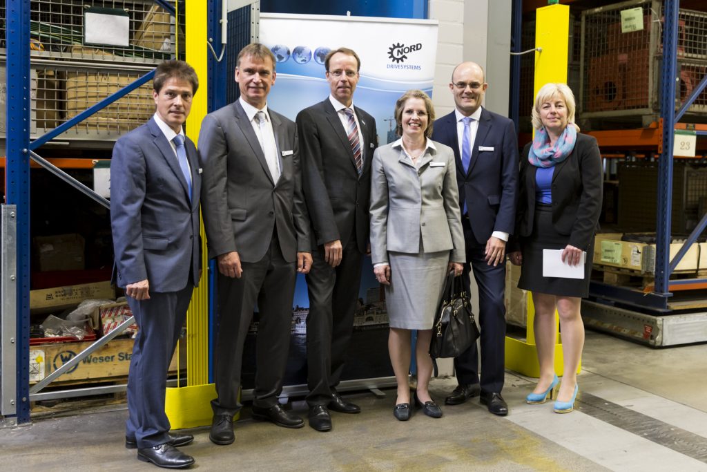 Plant Manager Steffen Timm (left) and NORD DRIVESYSTEMS Managing Director Jutta Humbert (4th from the left) greeted their guests of honor (from the left) Ulrich Howest, Mayor of Gadebusch, Dr. Christian Frenzel, State Secretary and Head of the State Chancellery Mecklenburg-Vorpommern, Dr. Nico Fickinger, NORDMETALL Federation of Metal and Electrical Industry, and Kerstin Weiss, Head of the Northwestern Mecklenburg District Authority