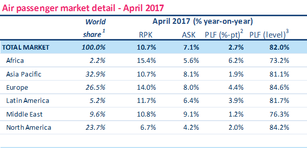 The International Air Transport Association (IATA) announced global passenger traffic data for April 2017 showing that demand (measured in revenue passenger kilometers or RPKs) rose by 10.7% compared to April 2016, which was the fastest pace in six years. April capacity (available seat kilometers or ASKs) increased by 7.1%, and load factor climbed 2.7 percentage points to 82.0%- a record for the month of April.
