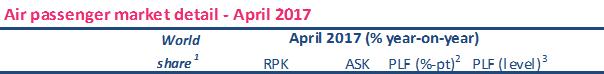 April international passenger demand rose 12.5% compared to April 2016, with all regions recording double-digit year-over-year traffic increases for the first time in 12 years. Total capacity climbed 7.7%, and load factor climbed 3.5 percentage points to 81.5%.