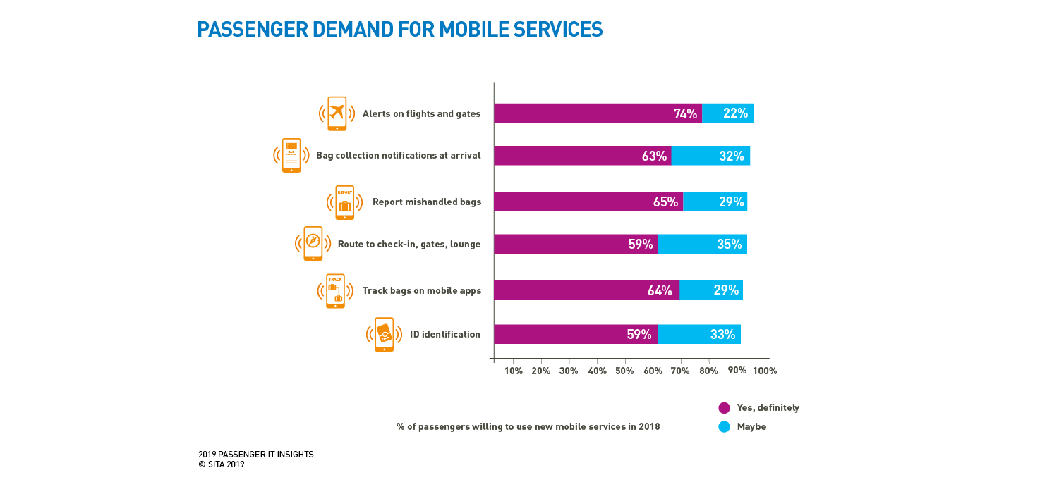 SITA’s research shows that 26% of passengers in 2018 used their mobile device to receive status updates on their baggage at arrival, up from 14% in 2017. At the same time, there is a growing demand from passengers to receive more baggage information via their mobile devices. A majority of passengers said they would definitely use mobile notifications providing information on baggage at arrival while a similar proportion said they would use their mobiles to track their bags or to report mishandled baggage.
