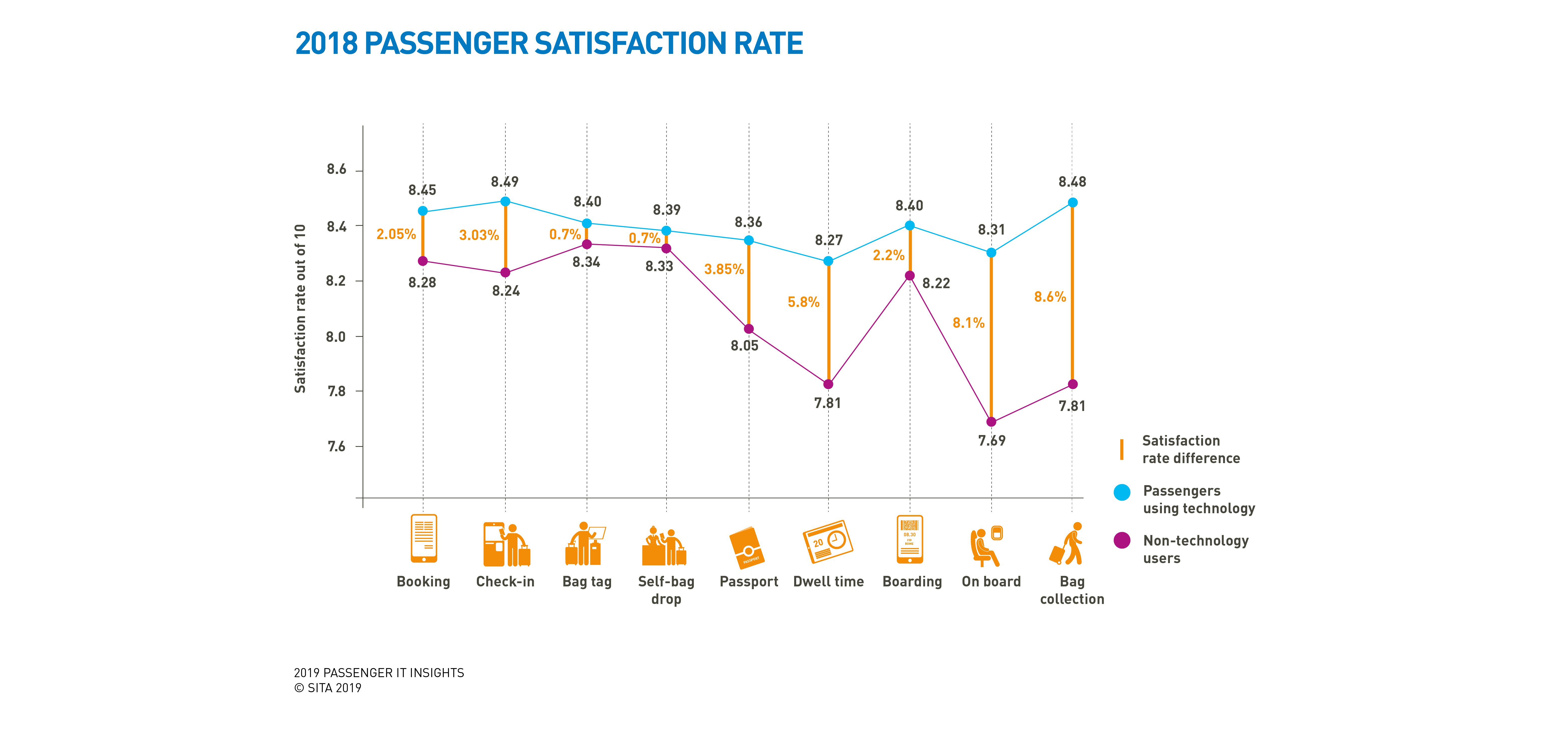 These mobile services have dramatically improved passenger satisfaction levels. In 2018, those travelers who used their mobile to receive updates at baggage collection were 8.6% more satisfied than those who relied on traditional voice announcements or flight information screens for information. In fact, those who relied on traditional voice or screen announcements for updates ranked baggage collection as one of the lowest points in their journey while those receiving mobile updates perceived this step as one where they were most satisfied.