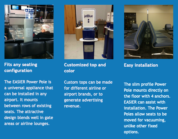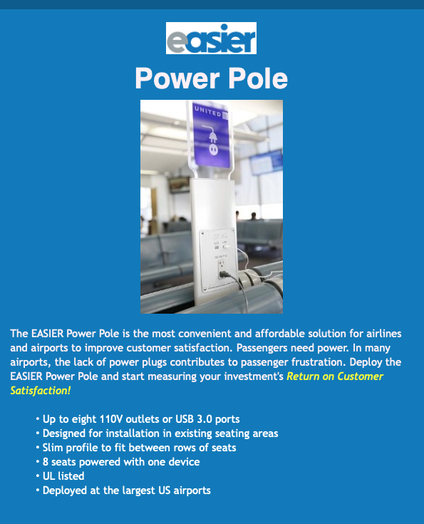 The EASIER Power Pole is the most convenient and affordable solution for airlines and airports to improve customer satisfaction. Passengers need power. In many airports, the lack of power plugs contributes to passenger frustration