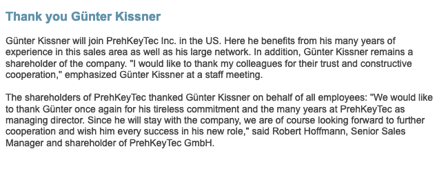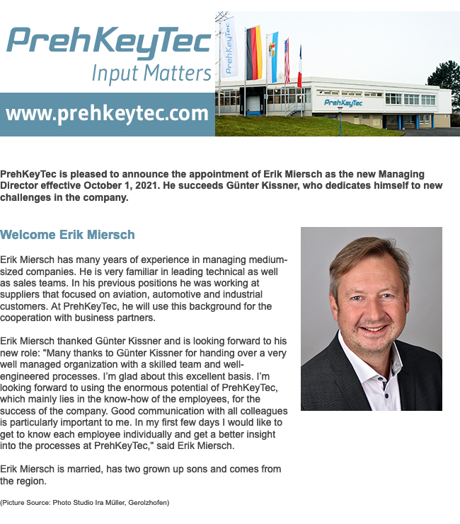 PrehKeyTec is pleased to announce the appointment of Erik Miersch as the new Managing Director effective October 1, 2021. He succeeds Günter Kissner, who dedicates himself to new challenges in the company. |