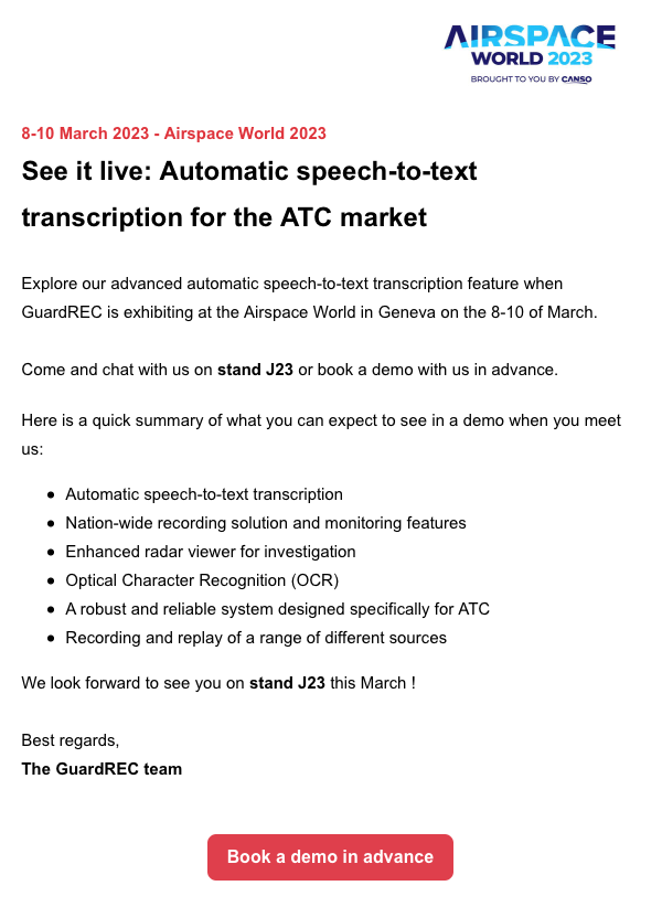 8-10 March 2023 – Airspace World 2023. See it live: Automatic speech-to-text transcription for the ATC market. Explore our advanced automatic speech-to-text transcription feature when GuardREC is exhibiting at the Airspace World in Geneva on the 8-10 of March.