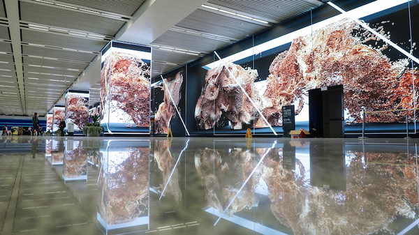 The centrepiece of this ambitious project is a gigantic 700m² videowall at the airport’s exit, which welcomes travellers and visitors into the adjacent shopping environment featuring a further 40 screens arranged into eight cubes, all of which are used to display the same vivid, cyberpunk-inspired 3D video content.