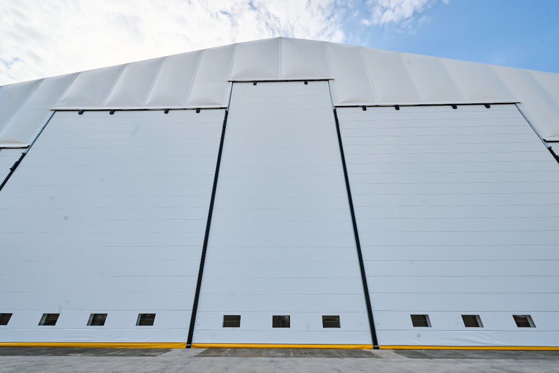 The aircraft hangar supports maintenance, repair, and overhaul activities for a wide range of aircraft. It includes integrated fire safety systems, heating, and a custom vertical-lifting hangar door.
