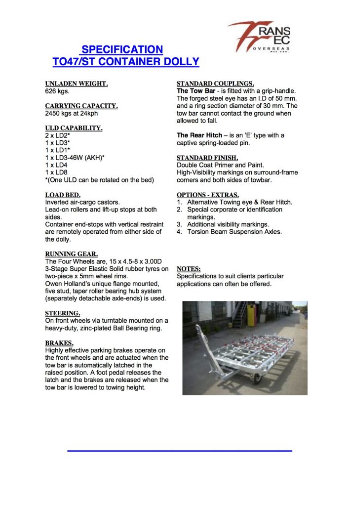 SPECIFICATION TO47/ST CONTAINER DOLLY