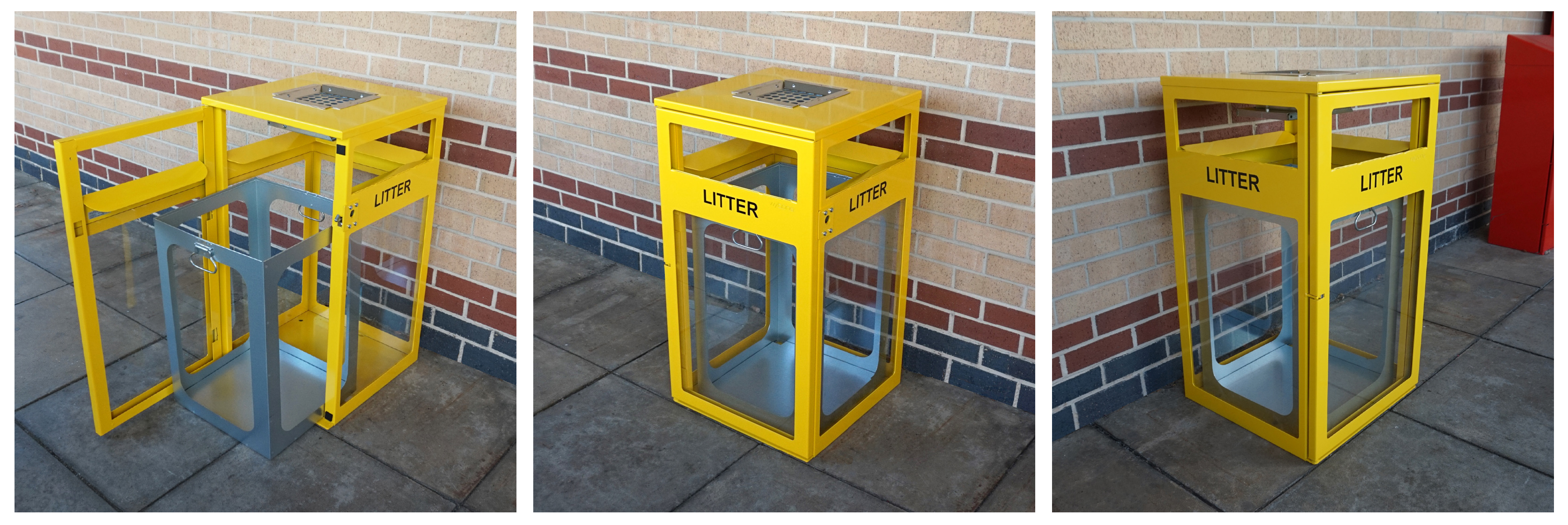 This version is based on our popular BMB2/40 Barnsley Litter Bin, manufactured from durable galvanised steel, and powder coated in yellow with transparent panels to all sides.
