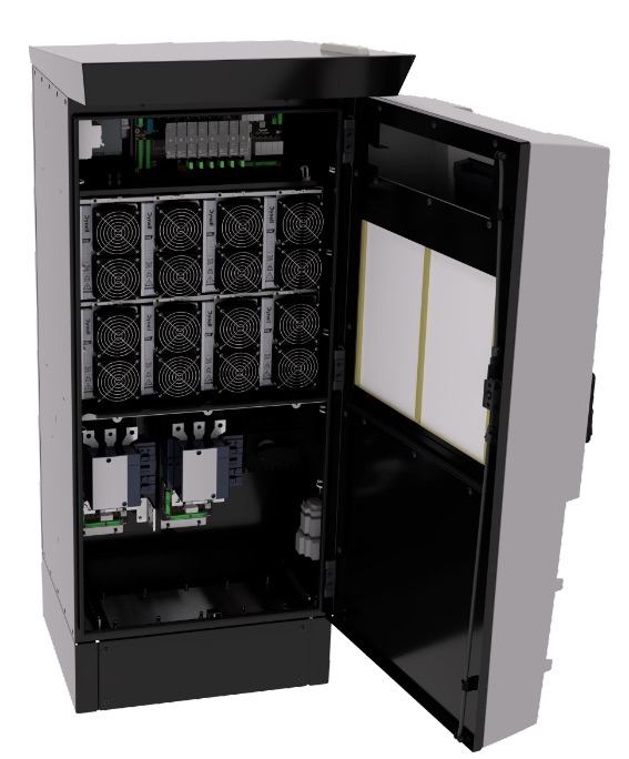 The nominal output power of one DIM is 22.5 kVA. This allows scalable output power of the solid-state frequency converters in steps of 22.5 kVA up to 180 kVA. The efficiency of up to 99% of one DIM module leads to an overall system efficiency of almost 96%. This can be achieved with reduced total harmonic distortion approved by TÜV Austria (Input current distortion <2% / output voltage distortion <1%).