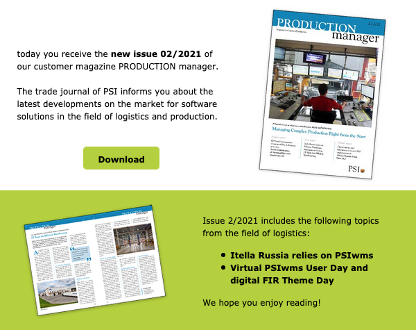 Today you receive the new issue 02/2021 of our customer magazine PRODUCTION manager. The trade journal of PSI informs you about the latest developments on the market for software solutions in the field of logistics and production.</span