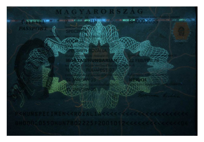 The most common security ink is the infrared ink – also called B900. According to the ICAO 9303 standard, the personal data and the MRZ of international travel documents are printed with this. Documents printed with B900 ink become visible under infrared light, while other optical elements, such as background texture, disappear.