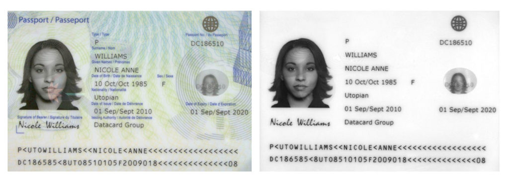 To protect IDs against copying, our personal documents are printed on special papers. These security papers are often referred to as UV-dull papers, and its verification is called UV-dull check – a process that can be performed both manually using a UV light or automatically by a passport reader device. When the document is printed on UV-dull paper, it should show a dark blue-purple color under UV; if not, the paper becomes white. It is a classic anti-copy feature that’s also applied to banknotes.
