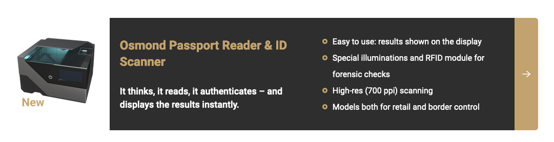 Osmond, the latest passport reader by Adaptive Recognition, helps verification by both its hardware and software. It has the special illuminations to visualize the optical features, while its software is capable of analyzing and verifying them – entirely automatically.