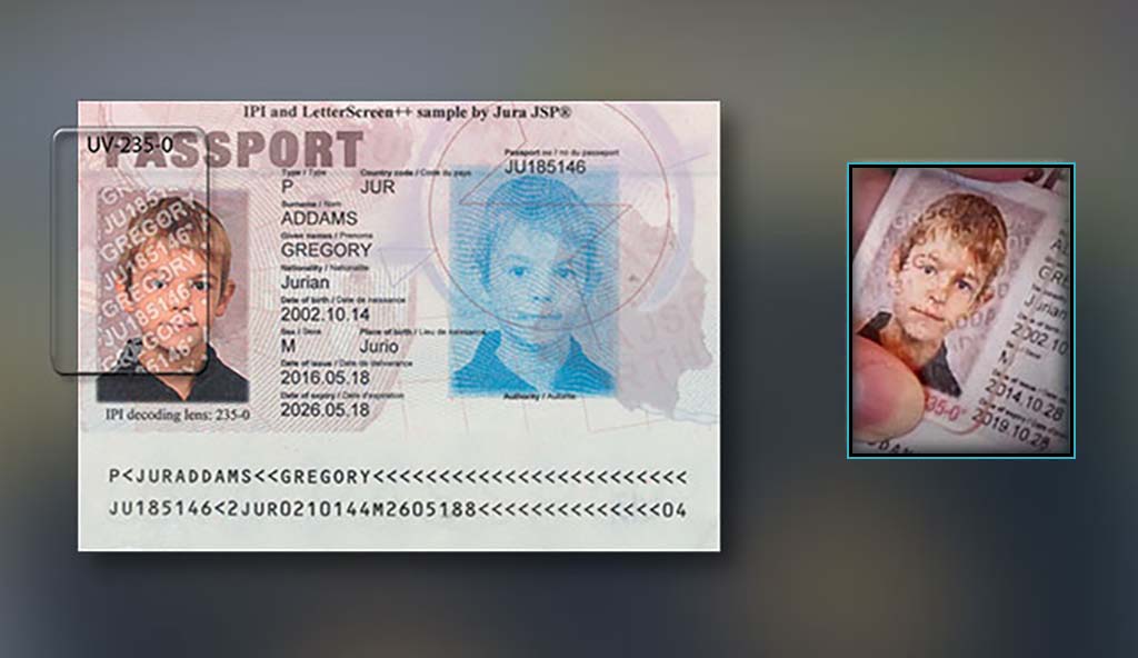 IPI is an invention of the security feature developer JURA. As its name shows, this security feature is invisible to the naked eye: it is an artificially generated code incorporated into the face portrait. To make it even more complex, the code is personalized, so there is a different code on each person’s ID.