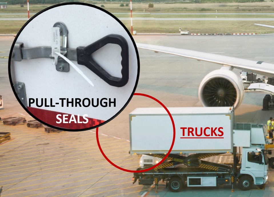 Ground operation logistic vehicles, such as trucks and trailers, should be sealed with indicative plastic seals to prevent intrusion once within airport boundaries. Universeal recommends the use of pull-through seals with metal and acetal inserts due to the higher level of sophistication they provide, giving clear evidence of tampering. Pull-through security seals are available in different lengths, pull-strengths and with/without tear-off facilities, to suit the particular requirement.