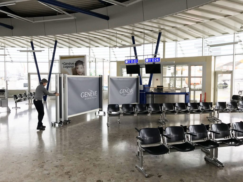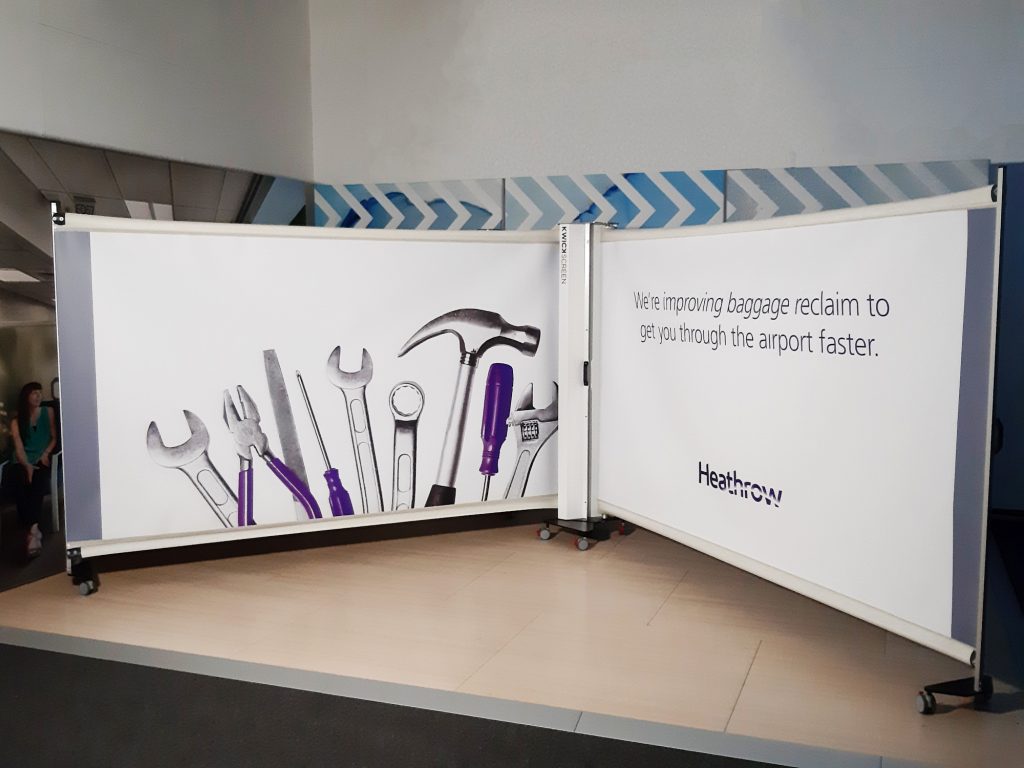 KwickScreen creating Security Partitioning. KwickScreens can be wheeled out to create instant privacy for security checks when a private area is required, and quickly retracted when not in use. Screens can also be used to partition off areas where essential maintenance works are being carried-out, or to simply zone off an area where staff do not wish passengers to go through – such as a closed gate or non active security desk.