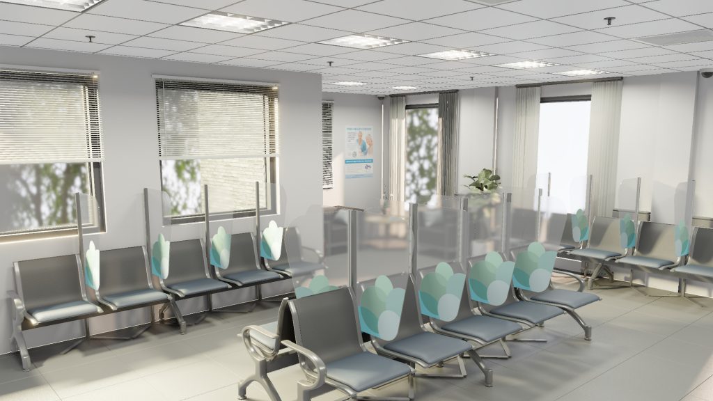 The Shield is our solution to social distancing in waiting rooms. A transparent screen that creates a Covid-secure barrier between seats, so two people can sit next to each other safely in airports.